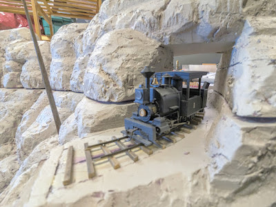 | Even though the rocks just have a primer coat, and there's no detailing, this shot starts to capture some of that "little train in a big landscape" vibe. |